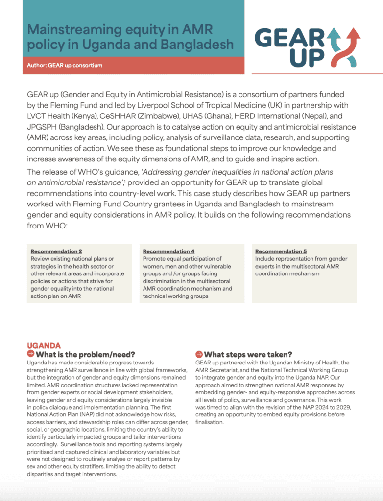 AMR policy has long been gender-blind, and this case study documents our work to change that. In Uganda, GEAR Up partnered with the Ministry of Health to embed gender and equity provisions into the revised National Action Plan 2024–2029. In Bangladesh, a scoping review of existing policy documents informed recommended changes to the National AMR Surveillance Strategy. Both examples offer a practical model for translating WHO guidance on gender and AMR into country-level action.